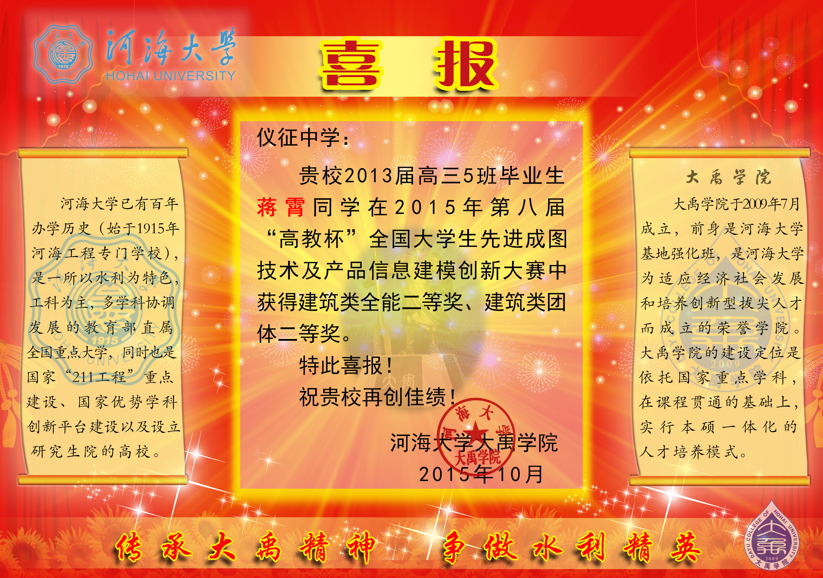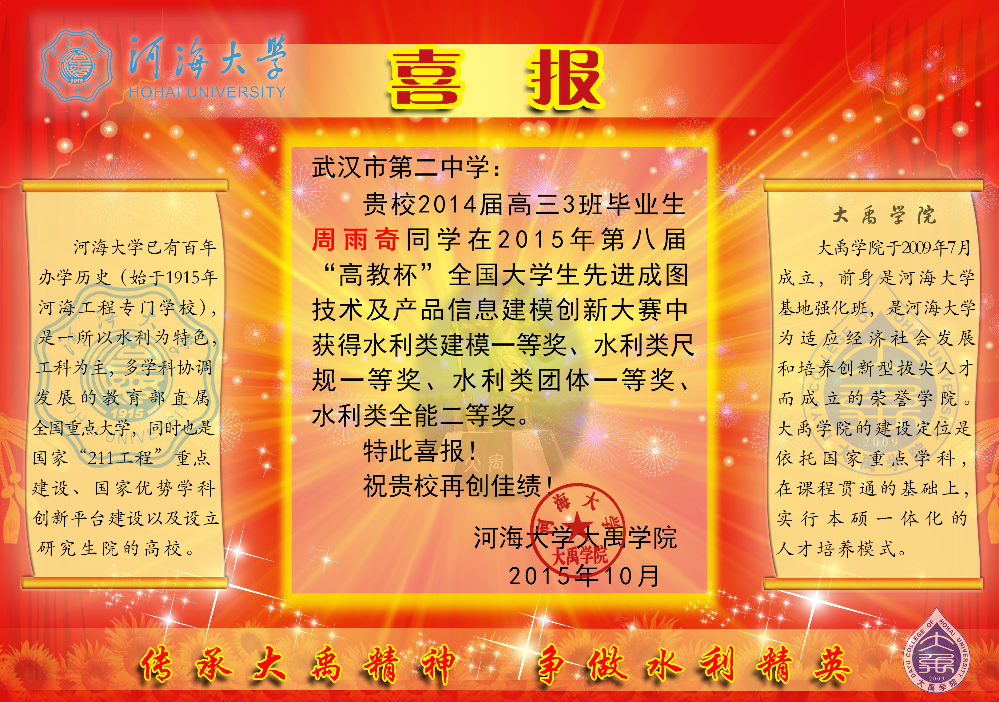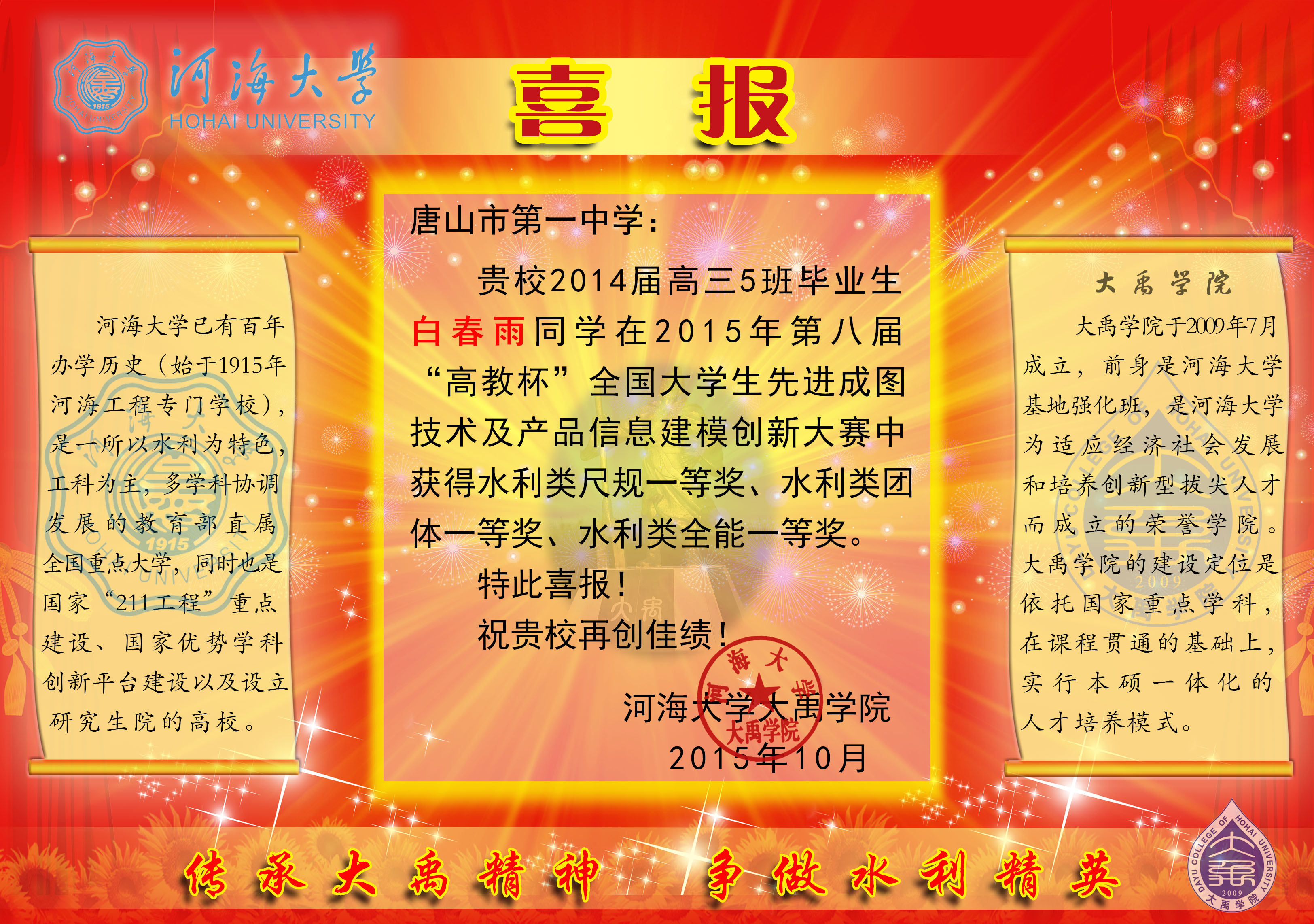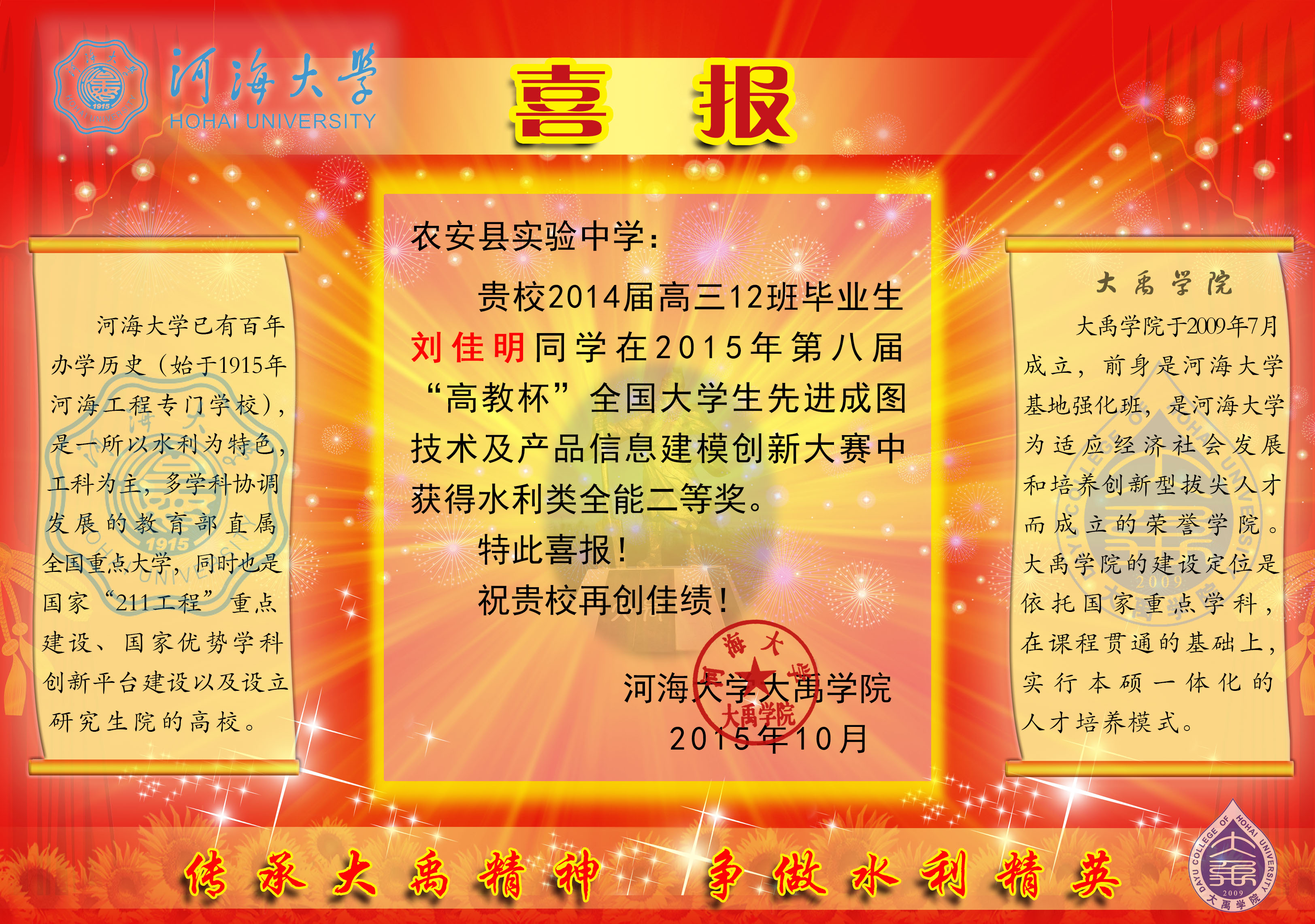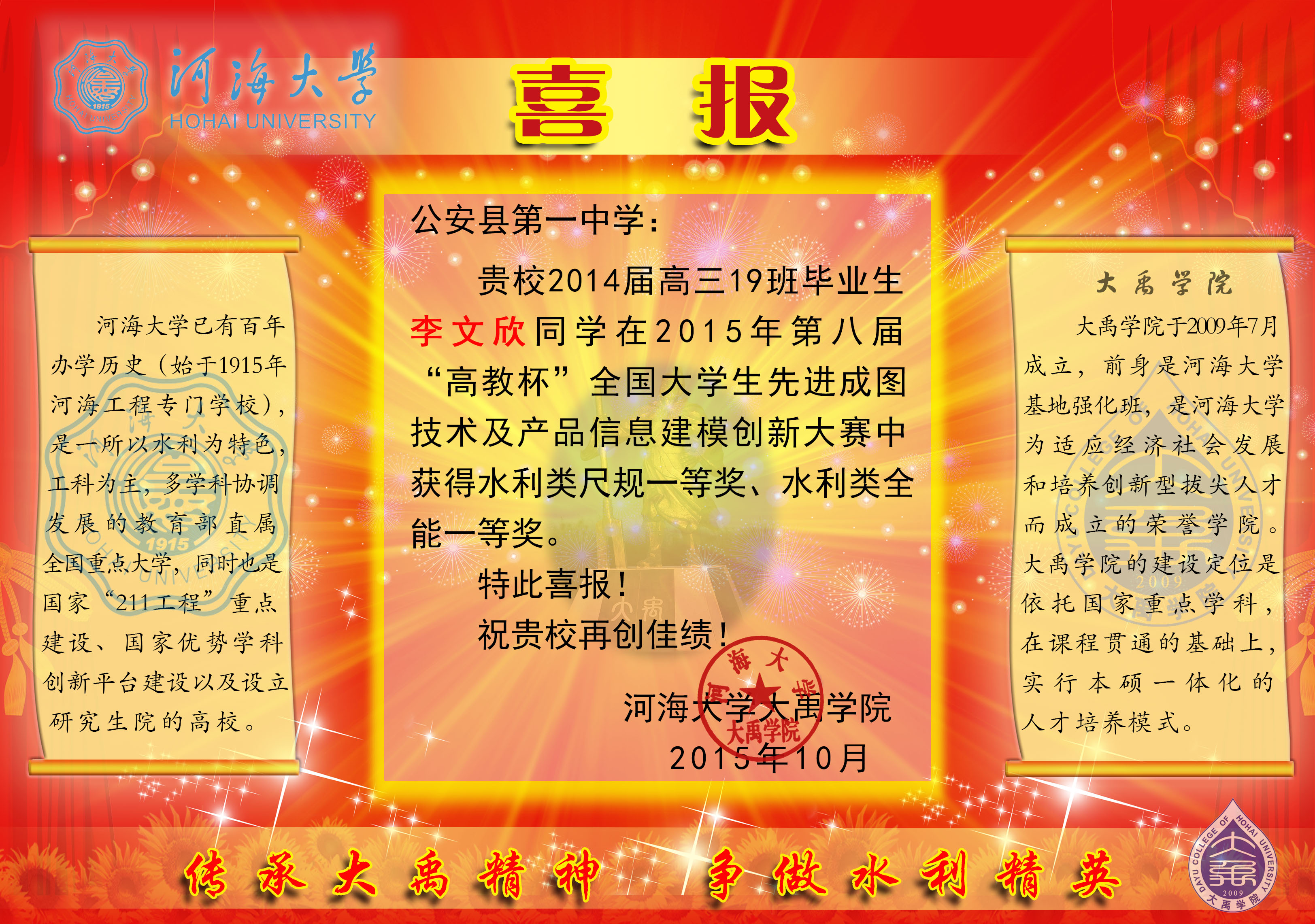 大禹学院自成立以来一直以来致力于培养学术精英和高素质拔尖创新型人才,鼓励同学们参加各类学科竞赛及科研创新活动。为激励同学们参加此类活动的热情,学院决定:凡获得省级以上荣誉的学生,学院通过制作喜报的形式,在全院进行张贴表扬,并将喜报寄往学生所在高中,与高中老师和同学们分享喜讯的同时,宣传了学生取得的优异成绩,提高了学校和学院的知名度。